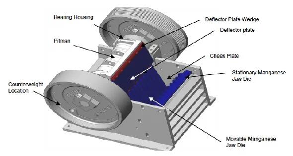 这种类型的破碎机通过在两个夹爪之间挤压岩石来压碎岩石:一个固定和一个移动。活动钳口(Pitman)连接到偏心轴上,使其以往复运动方式移动。岩石从顶部进入破碎室,然后移动通过该室,随着它变深,该室变窄,直到它被夹在两个颚之间,在这里被挤压直到它破裂。